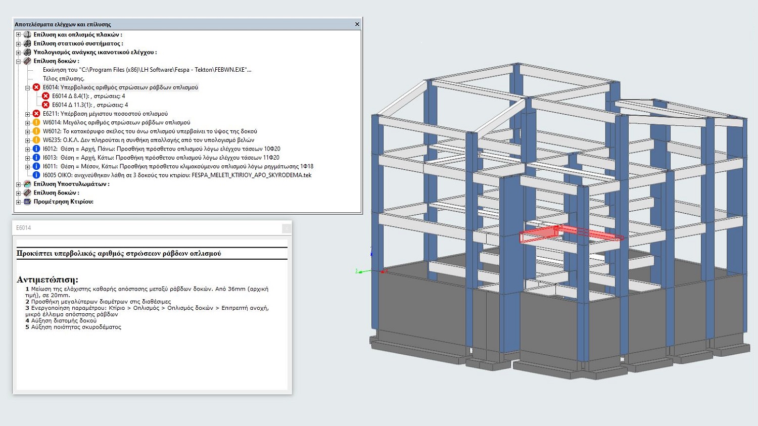 Με ένα μόνο κλικ, όλα τα μέλη που σχετίζονται με το ίδιο σφάλμα επισημαίνονται ταυτόχρονα τόσο στο 3D περιβάλλον του Fespa όσο και στην κάτοψη, επιτρέποντας τον άμεσο εντοπισμό των πιο κρίσιμων θεμάτων της μελέτης.